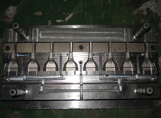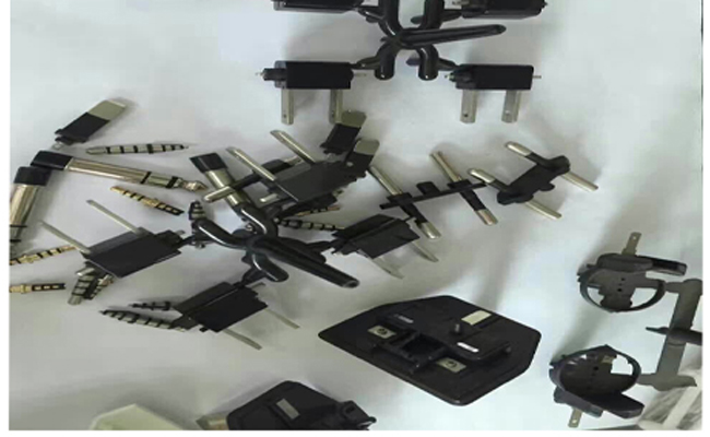 采用JTT-550R圆盘机注塑插头的段子一模可出20个,两排一次注塑出40个插头端子